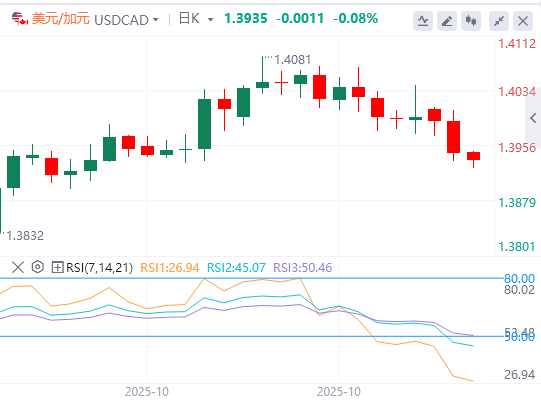10月29日,美元/加元连续第三个交易日扩大跌幅,周三欧洲早盘交投于1.3930附近。由于该货币对跌破九天指数移动平均线(EMA),短期价格动能较弱。此外,14天相对强弱指数(RSI)已跌破50水平,表明势头转向看跌区域。