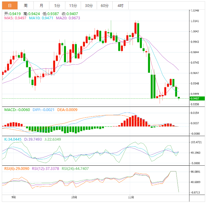 周四盘中,美元兑瑞郎下跌至0.9409,跌幅0.20%。