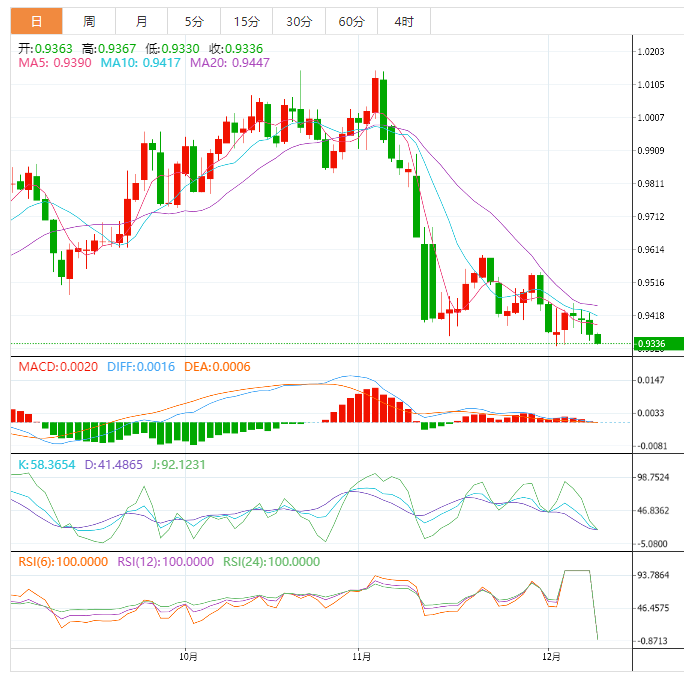 周五盘中,美元兑瑞郎下跌至0.9338,跌幅0.29%。