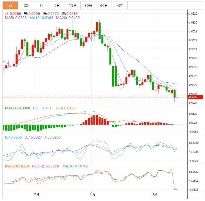 周三盘中,美元兑瑞郎上涨至0.9288,涨幅0.02%。