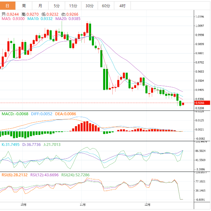 周四盘中,美元兑瑞郎上涨至0.9268,涨幅0.25%。