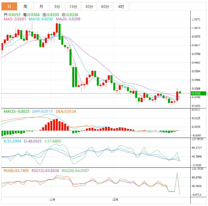 该货币对已经轻松地转移到了50期指数移动平均线(EMA) 0.9287之上,这表明短期趋势已经转为看涨。此外,该货币对还试图突破0.9388的200-均线。