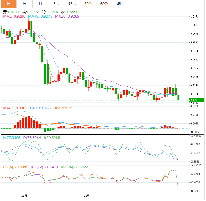 周一盘中,美元兑瑞郎下跌至0.9225,跌幅0.60%。