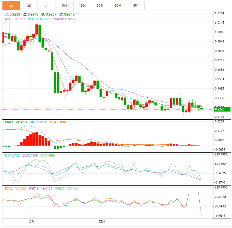 周二盘中,美元兑瑞郎下跌至0.9240,跌幅0.18%。