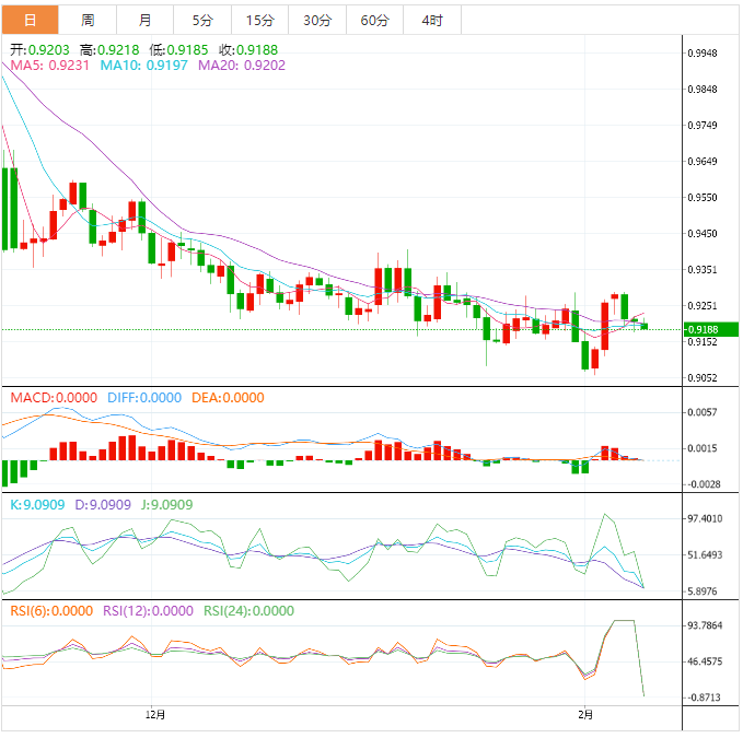 周四盘中,美元/瑞郎空头测试0.9200关口,刷新盘中低位。