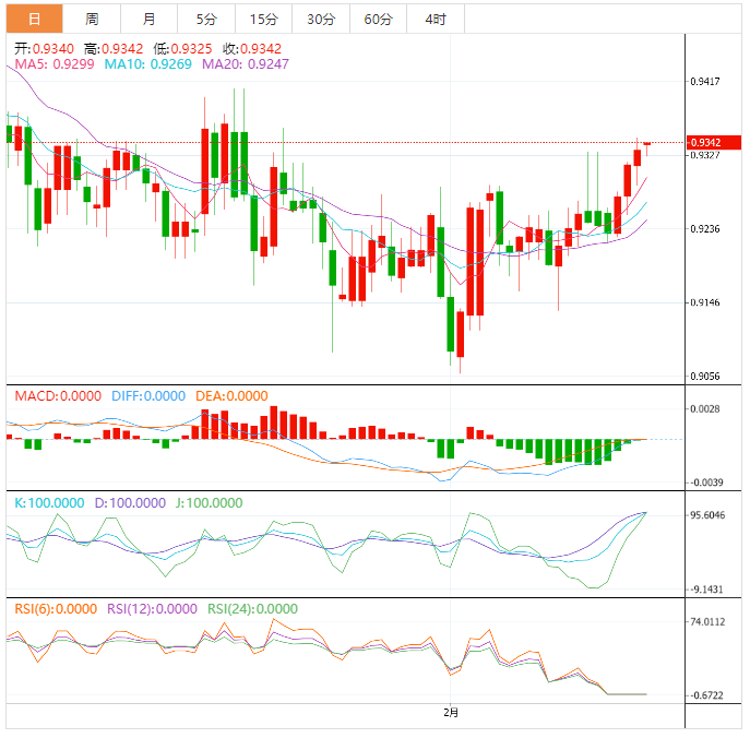 周五盘中,美元兑瑞郎上涨至0.9343,涨幅0.02%。