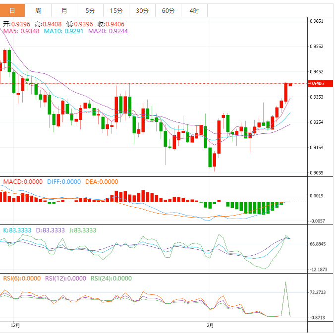 周一亚洲早盘温和回调后,美元兑瑞郎收复了一轮阻力位0.9400。在美国公布消费者支出增幅高于预期后,瑞郎资产周五受到热烈追捧。受工资指数上涨的推动,美国1月份个人消费支出(PCE)跃升0.6%,这让美国家庭高兴地持有更多资金用于处置。