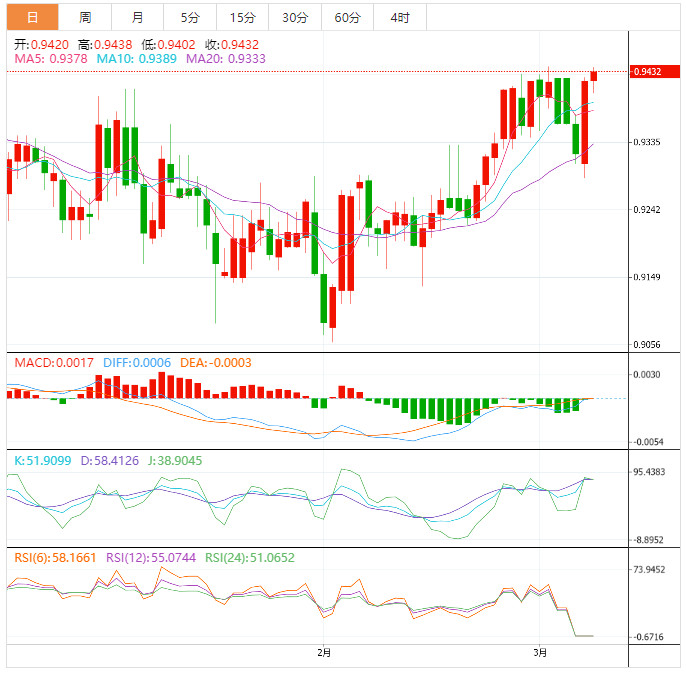 周三盘中,美元兑瑞郎上涨至0.9433,涨幅0.13%。