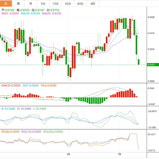 或者,如果跌破0.9165附近的五周上行支撑线,将毫不犹豫地挑战2月初在0.9130附近的波动低点,并突出之前的月度低点0.9060。