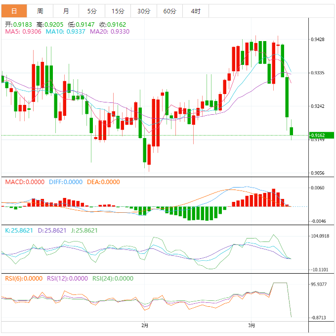 美元兑瑞郎跌破20日和50日指数移动平均线(ema)的汇合点,上周五将日跌幅扩大至1%以上。美国就业报告好坏参半,令美元承压。美国银行倒闭导致市场情绪恶化,这可能会对美国产生溢出效应。截止目前,美元/瑞郎的交易价为0.9216。