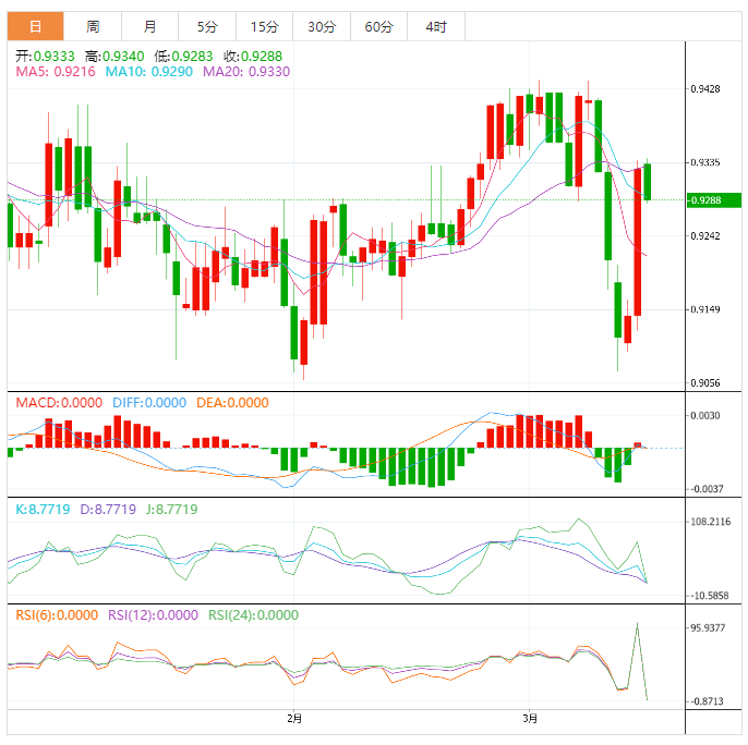 周四盘中,美元兑瑞郎下跌至0.9291,跌幅0.41%。