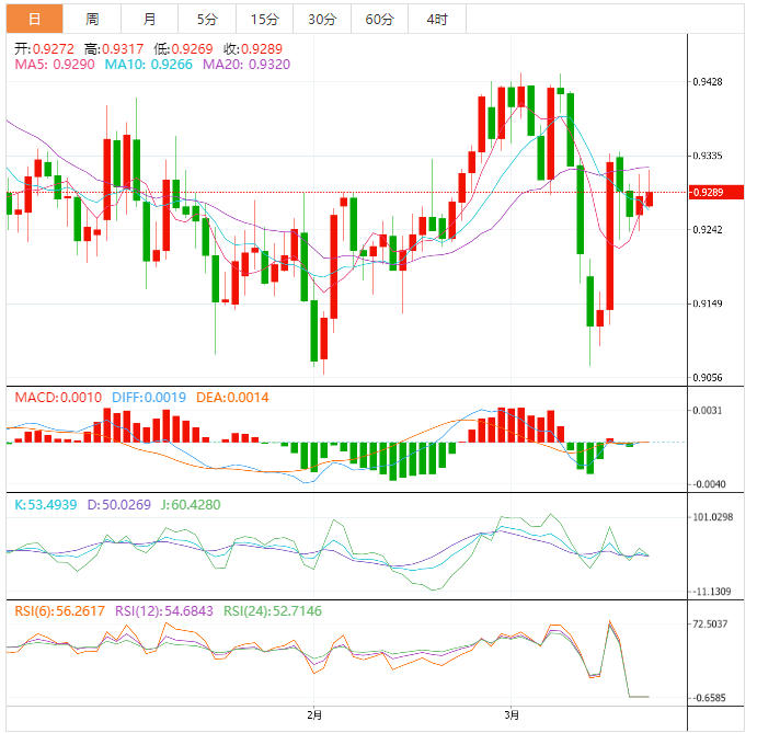 周二盘中,美元兑瑞郎上涨至0.9291,涨幅0.05%。
