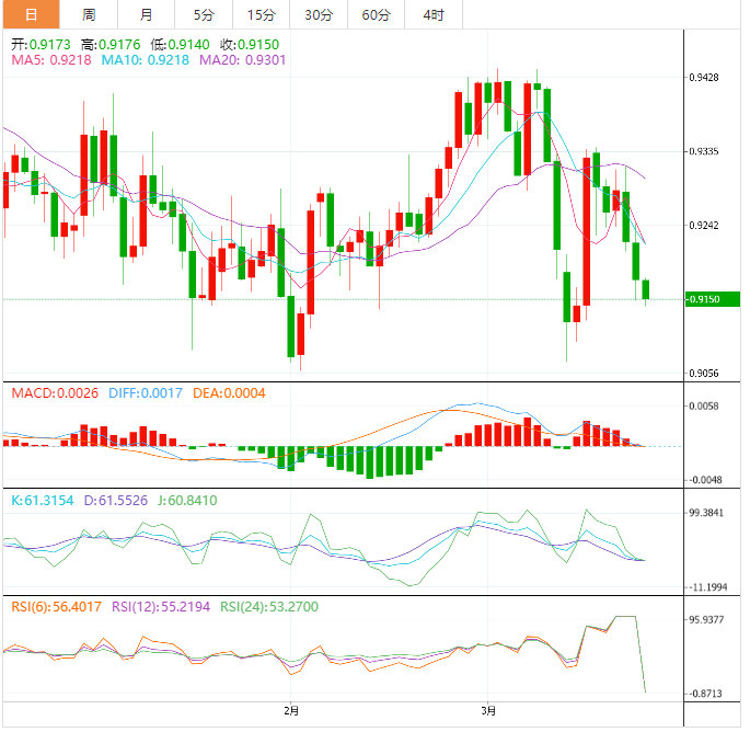 周四盘中,美元兑瑞郎下跌至0.9152,跌幅0.25%。