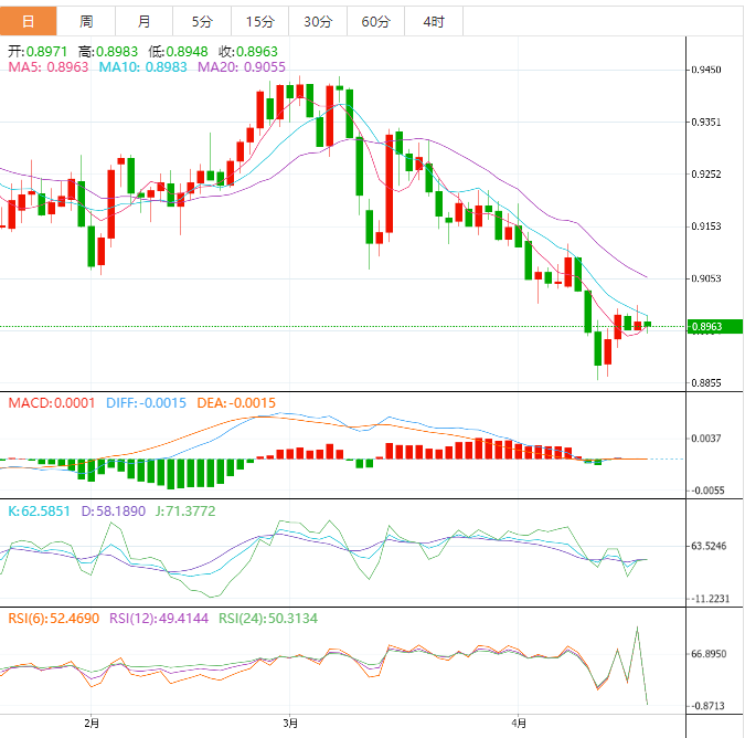 周四盘中,美元兑瑞郎下跌至0.8965,跌幅0.08%。