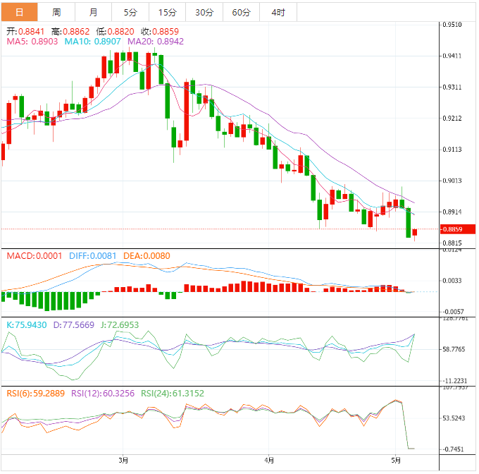 预计今天的交易区间在0.8740支撑位和0.8890阻力位之间。