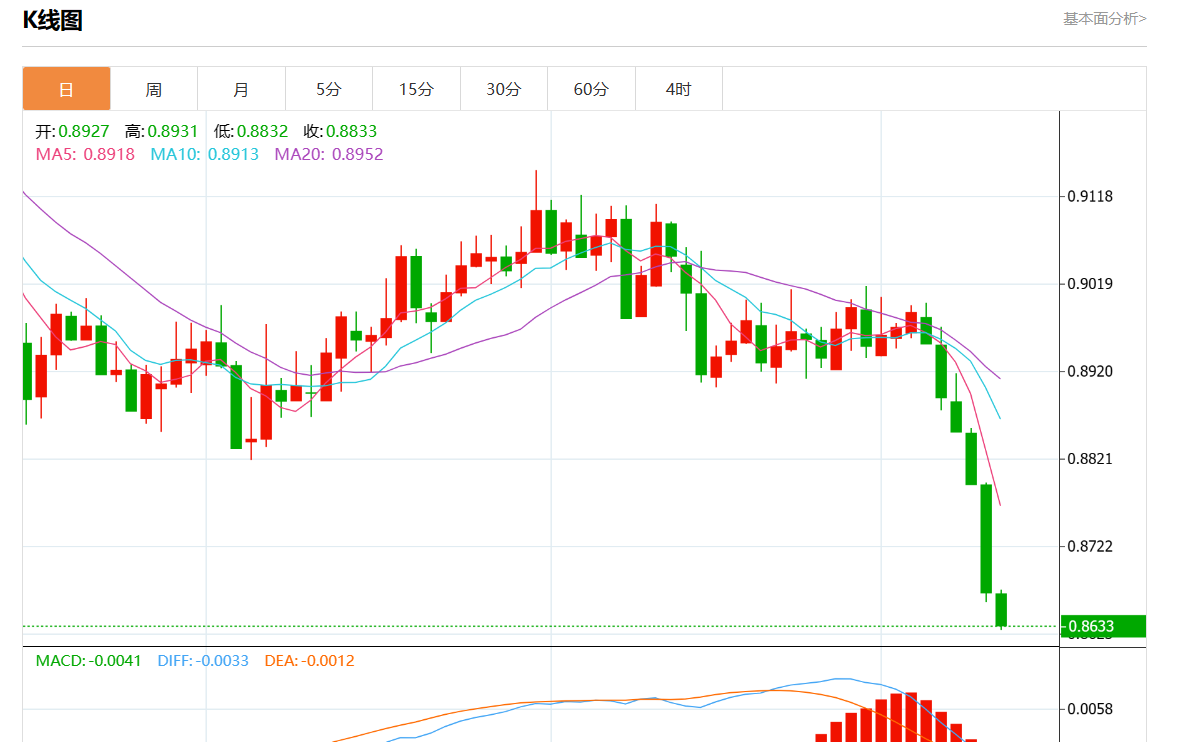 周四盘中,美元/瑞郎最新报0.8631,日图跌0.45%