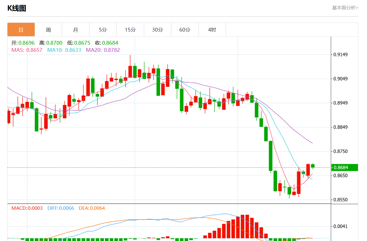 周二盘中,美元/瑞郎报0.8681,跌幅0.17%。