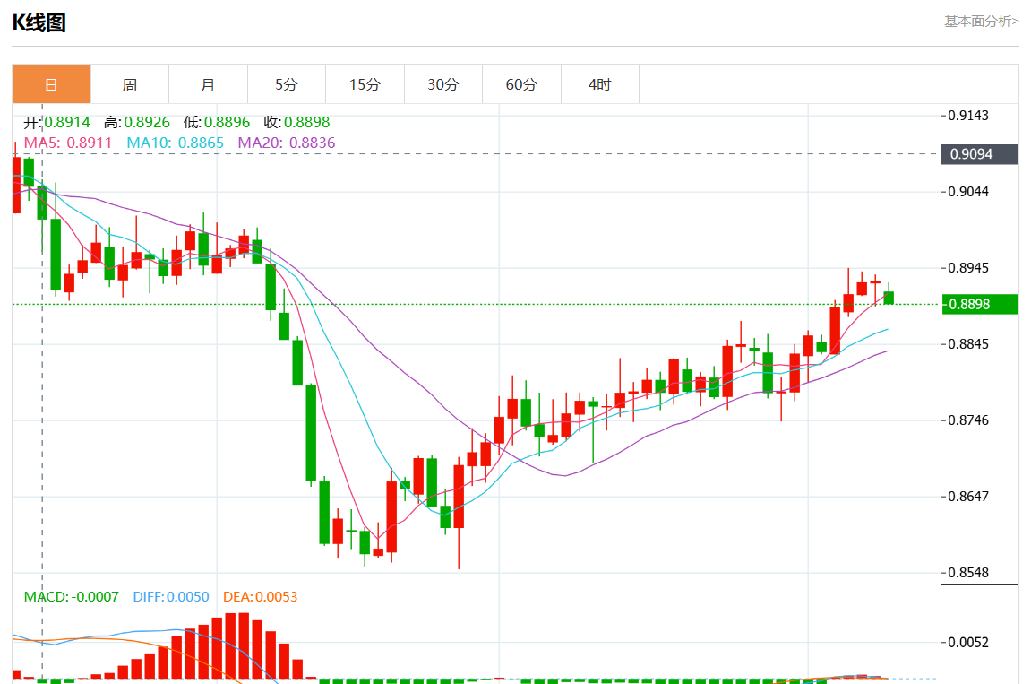 周一盘中,美元/瑞元报0.8899,跌幅0.32%。