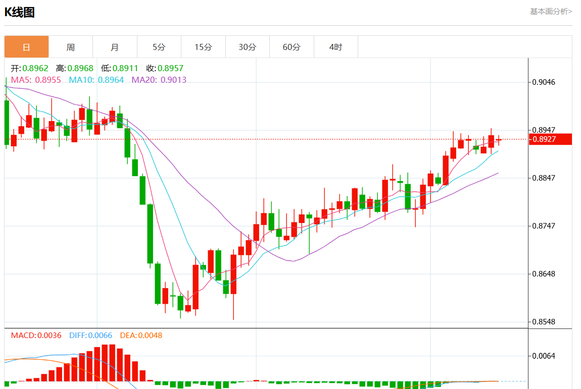 周四盘中,美元/瑞元报0.8927,跌幅0.09%。