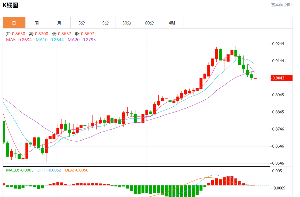 周三盘中,美元/瑞元报0.9042,涨幅0.02%。