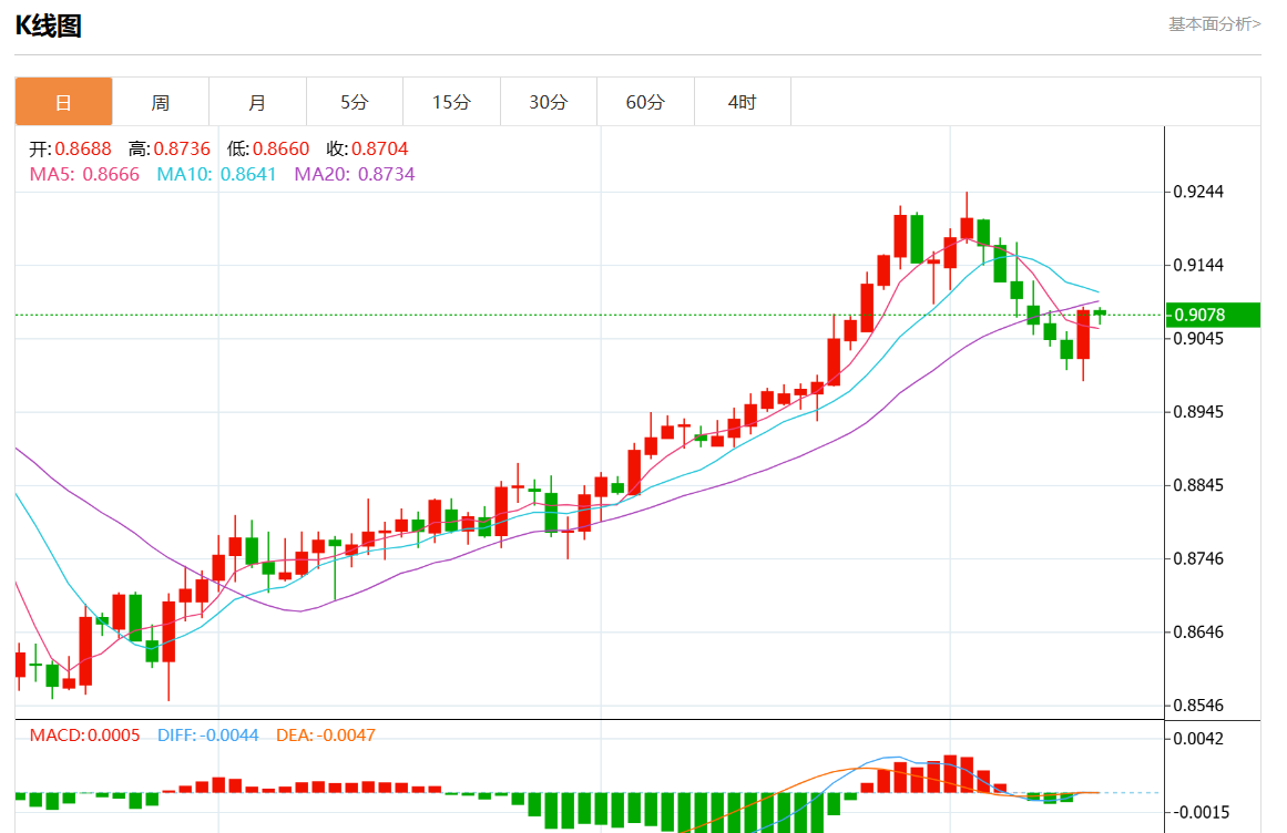 周五盘中,美元/瑞元报0.9070,跌幅0.14%。