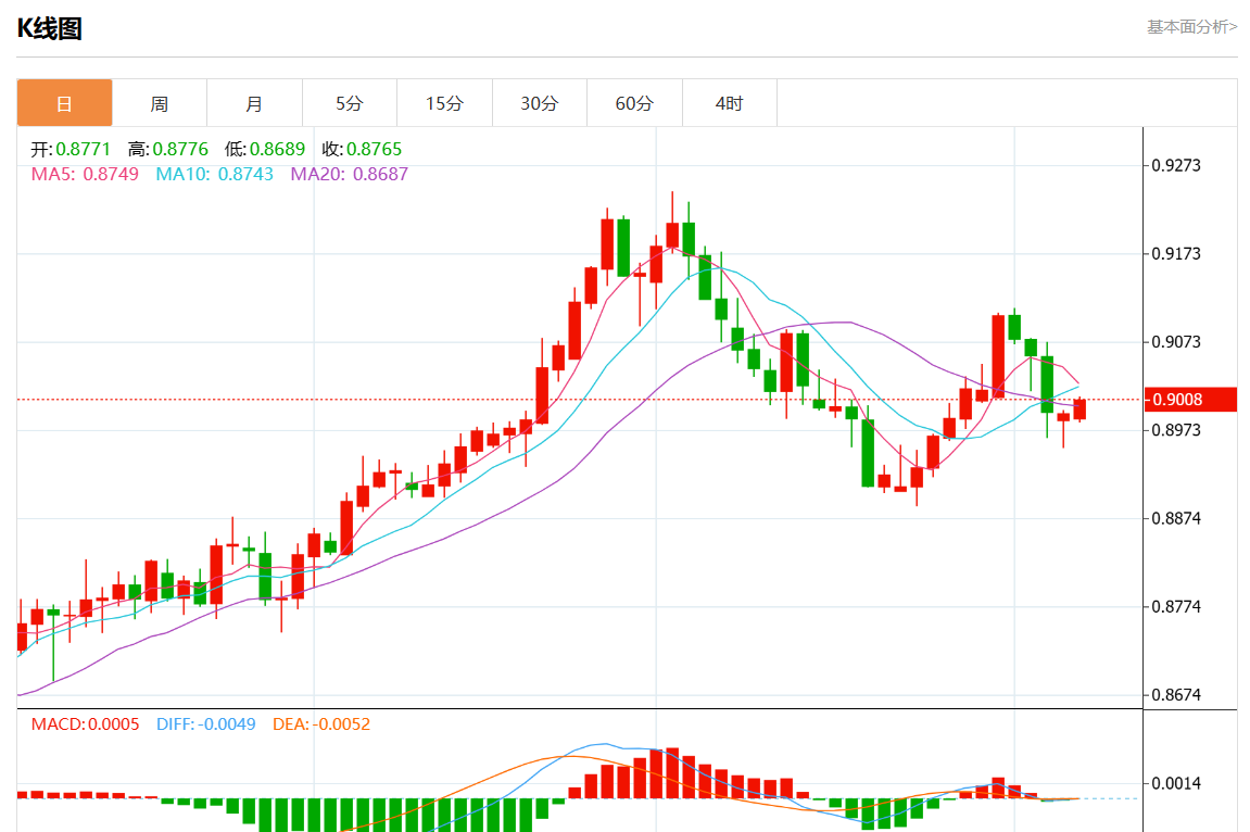 周二盘中,美元/瑞元报0.9008,涨幅0.17%。
