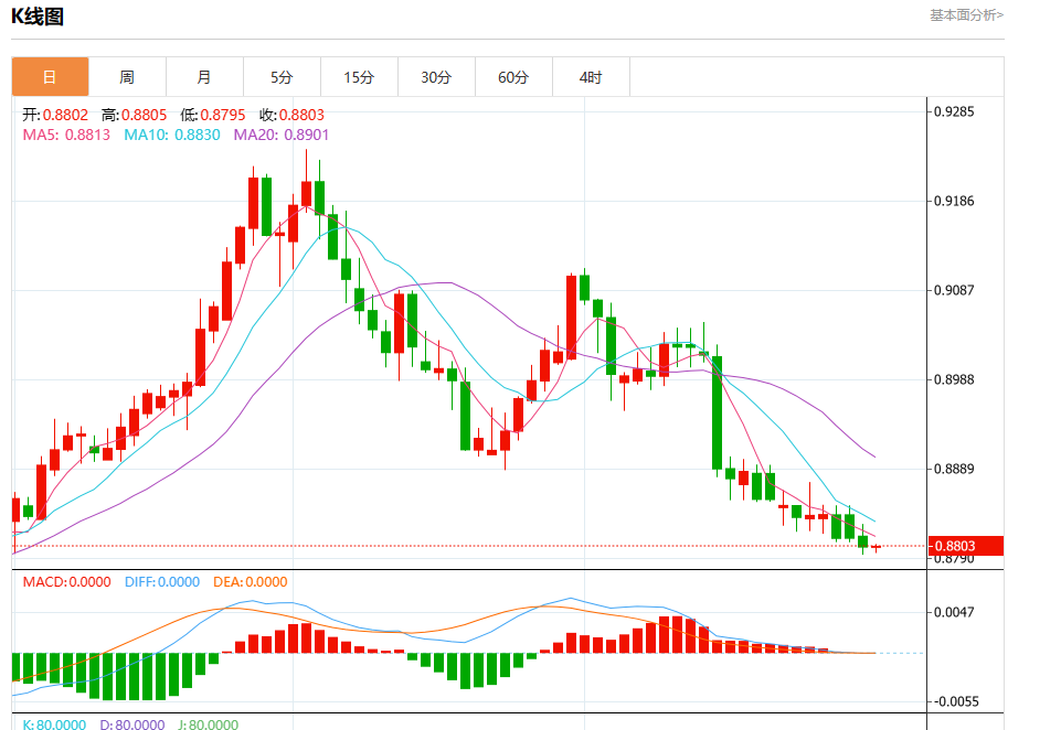 周一盘中,美元/瑞元报0.8801,跌幅0.02%。