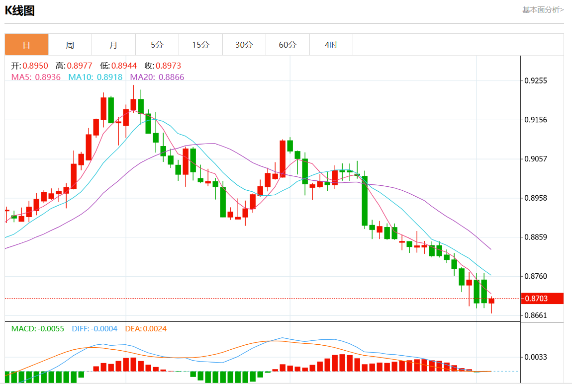 周一盘中,美元/瑞元报0.8704,涨幅0.14%。