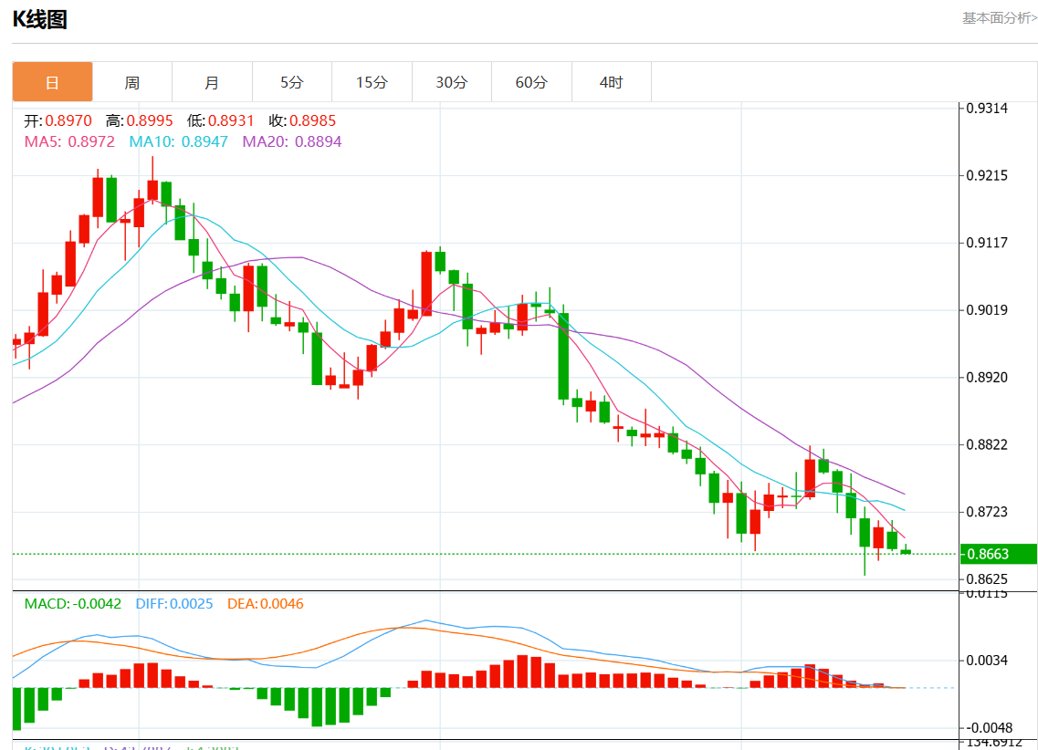 周二盘中,美元/瑞元报0.8662,跌幅0.09%。