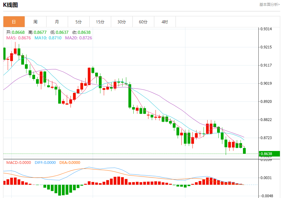 周二纽盘,瑞郎兑美元交投于0.8640,跌幅为0.37%。