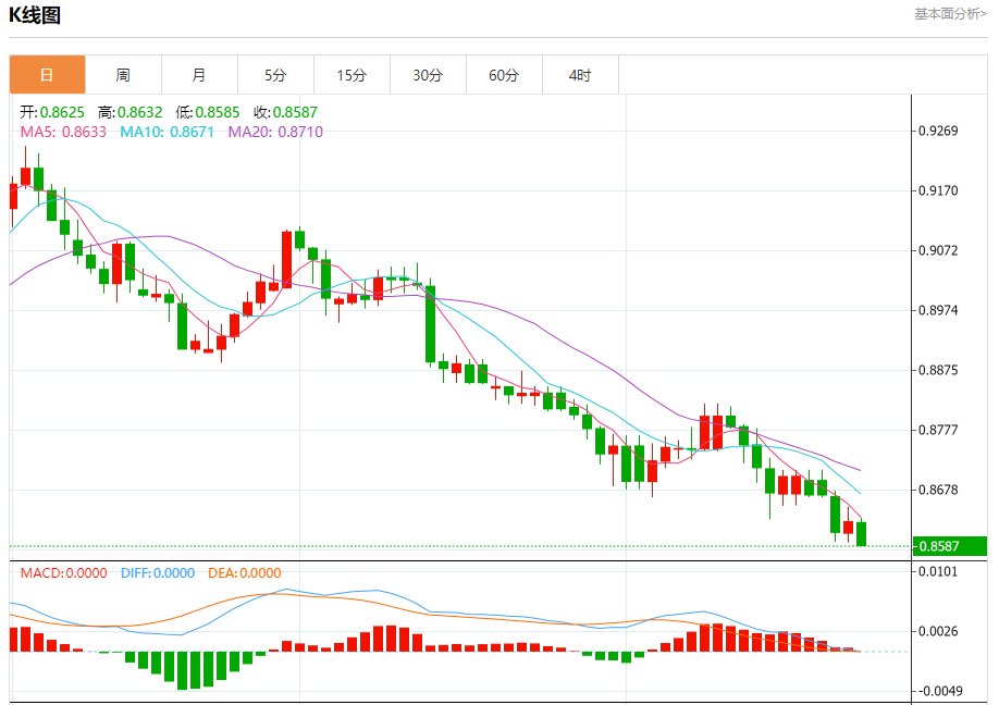 周四纽盘,瑞郎兑美元交投于0.8589,跌幅为0.45%。