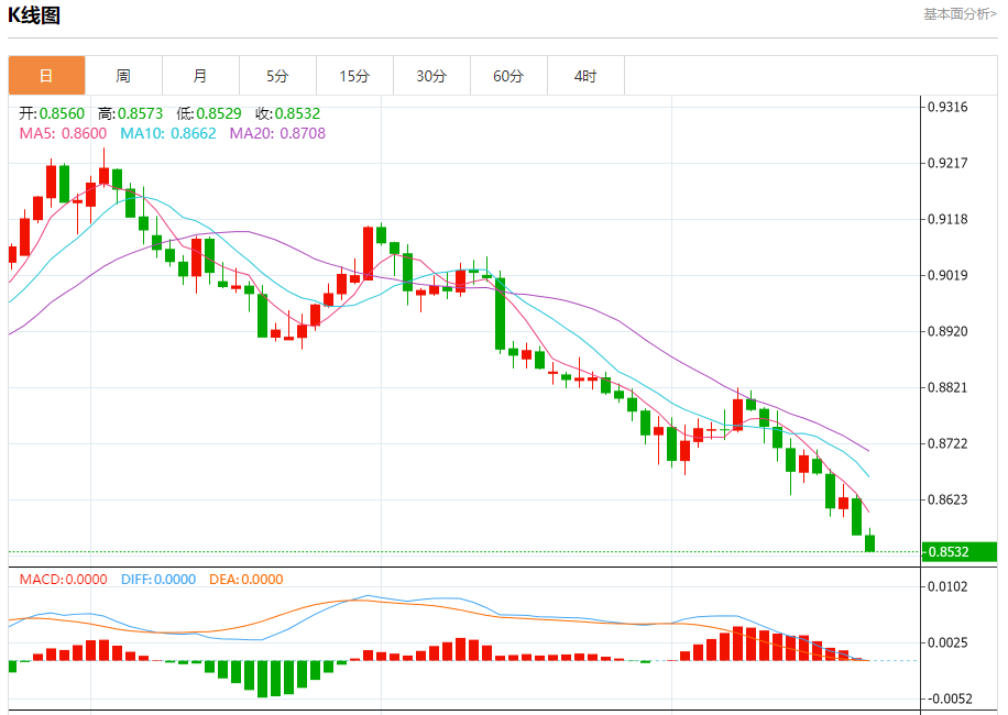 周五纽盘,瑞郎兑美元交投于0.8535,跌幅为0.33%。