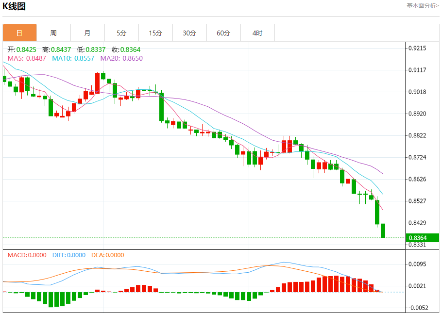 周四纽盘,瑞郎兑美元交投于0.8365,跌幅为0.72%。