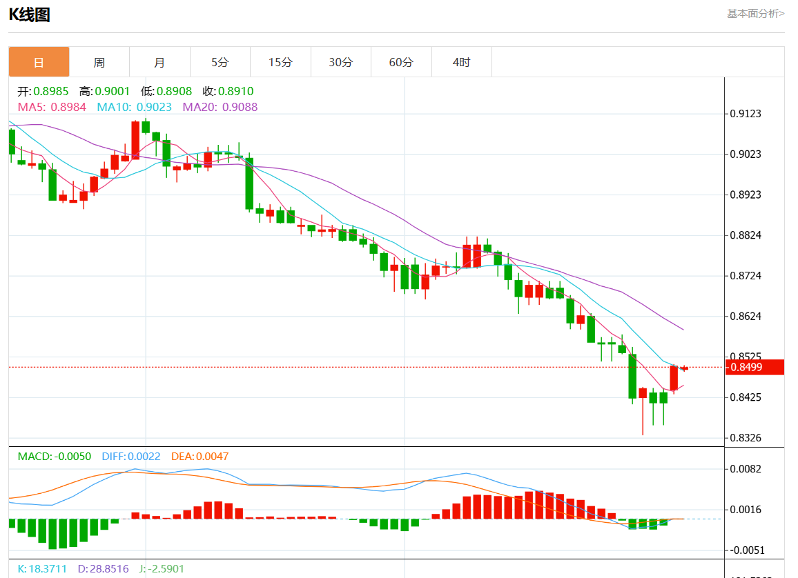 周三盘中,美元/瑞元报0.8499,跌幅0.04%。