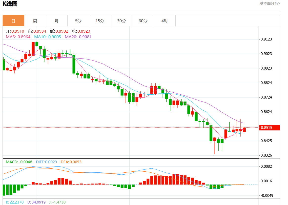 周一盘中,美元/瑞元报0.8513,涨幅0.09%。