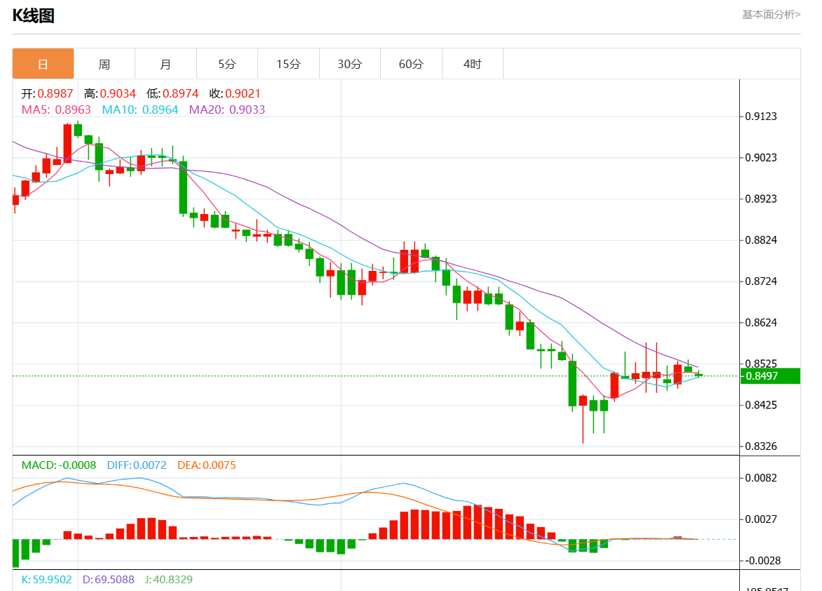 周四盘中,美元/瑞元报0.8496,跌幅0.13%。