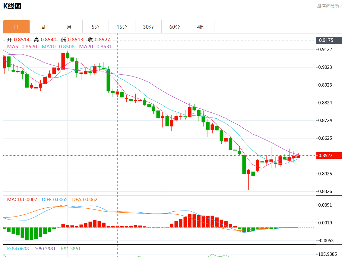 周一盘中,美元/瑞元报0.8526,涨幅0.01%。