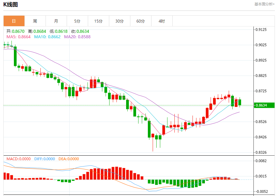 今天的预期交易范围在0.8600支撑和0.8750阻力之间。