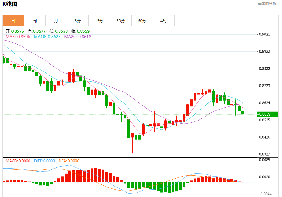 周五纽盘,瑞郎兑美元交投于0.8560,跌幅为0.21%。