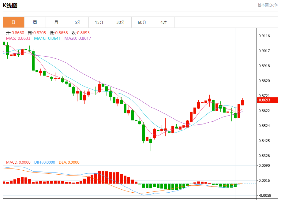 今天的预期交易范围在0.8610支撑和0.8760阻力之间。