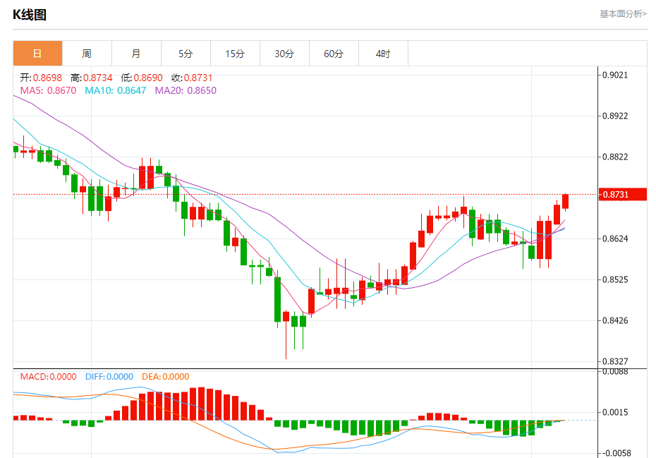 今天的预期交易范围在0.8650支撑和0.8790阻力之间。