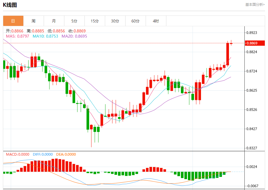 周三纽盘,瑞郎兑美元交投于0.8871,跌幅为0.01%。