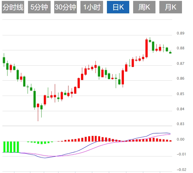 今天的预期交易区间在0.8720支撑位和0.8850阻力位之间。