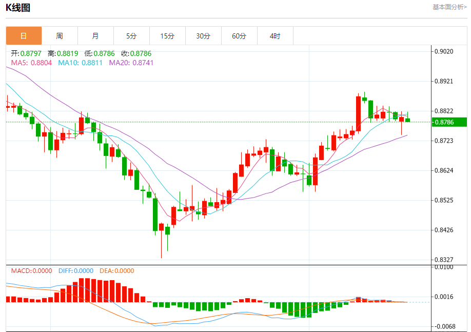 今天的预期交易范围在0.8720支撑和0.8860阻力之间。