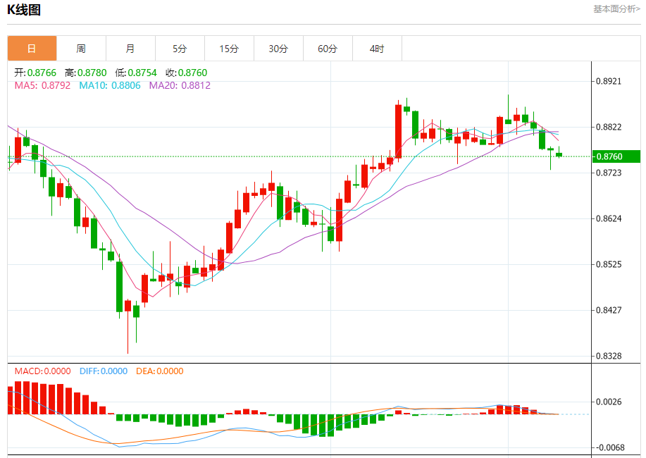 周一纽盘,瑞郎兑美元交投于0.8761,跌幅为0.07%。
