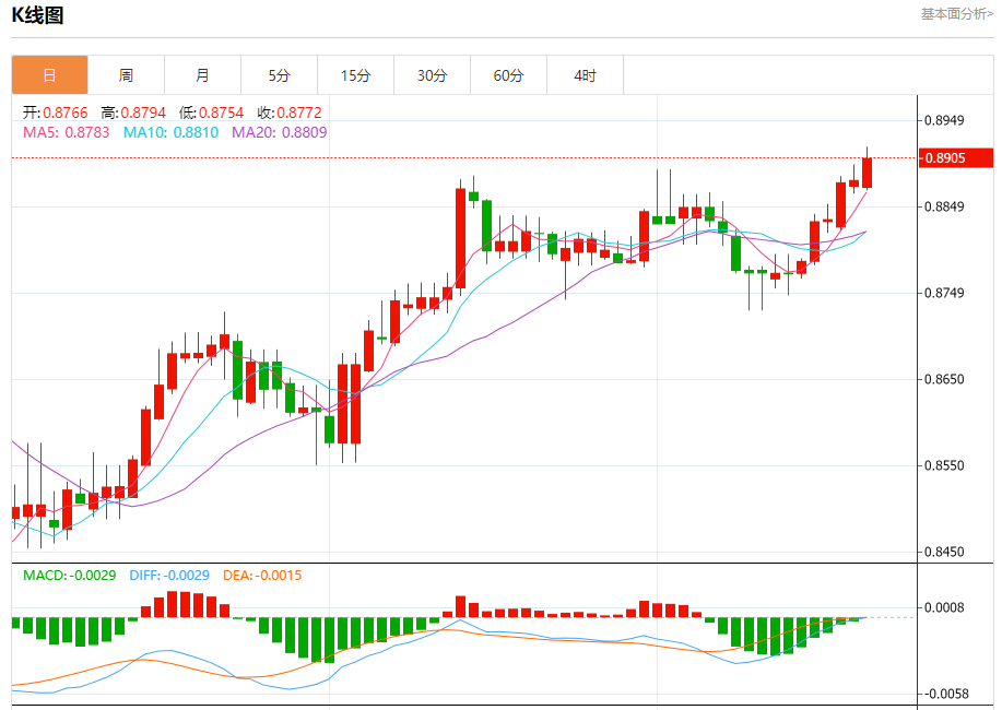 周三纽盘,瑞郎兑美元交投于0.8907,涨幅为0.29%。