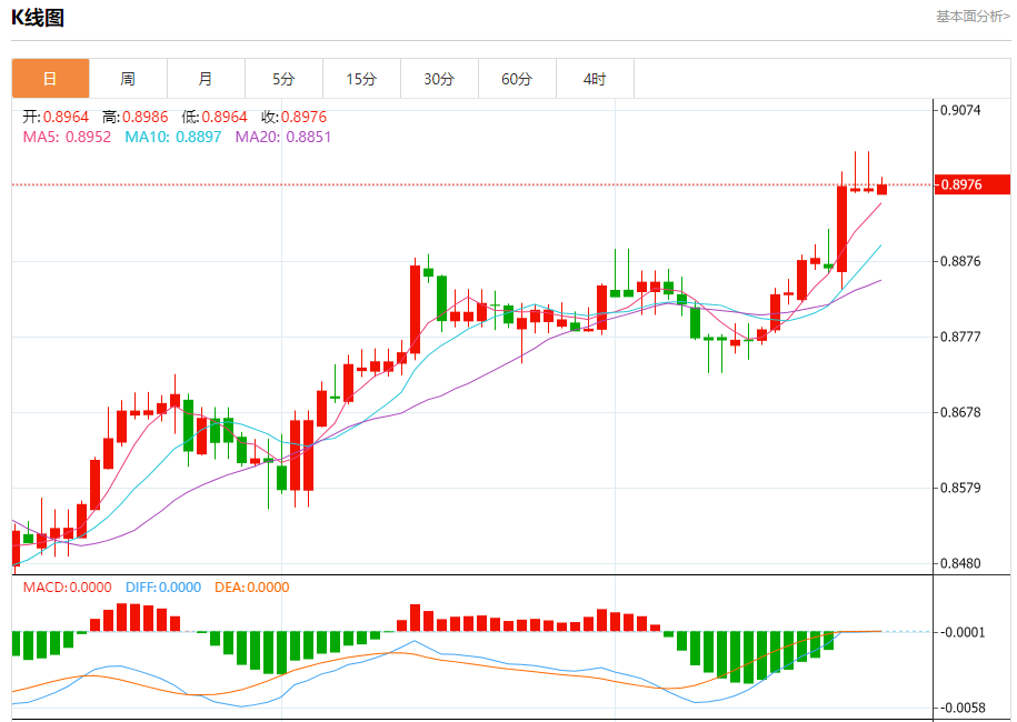 周一纽盘,瑞郎兑美元交投于0.8978,涨幅为0.06%。
