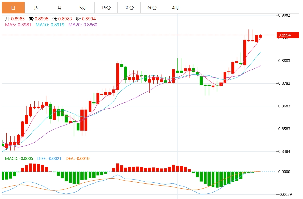 周二欧盘,美元/瑞郎连续第二天走势,在欧洲早盘时段升至0.9000附近。美元(USD)在美联储(Fed)官员的鹰派言论推动下上涨。