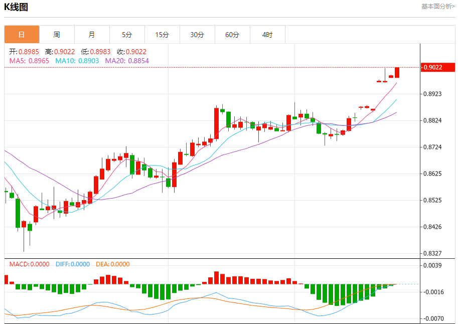 周二纽盘,瑞郎兑美元交投于0.9023,涨幅为0.32%。