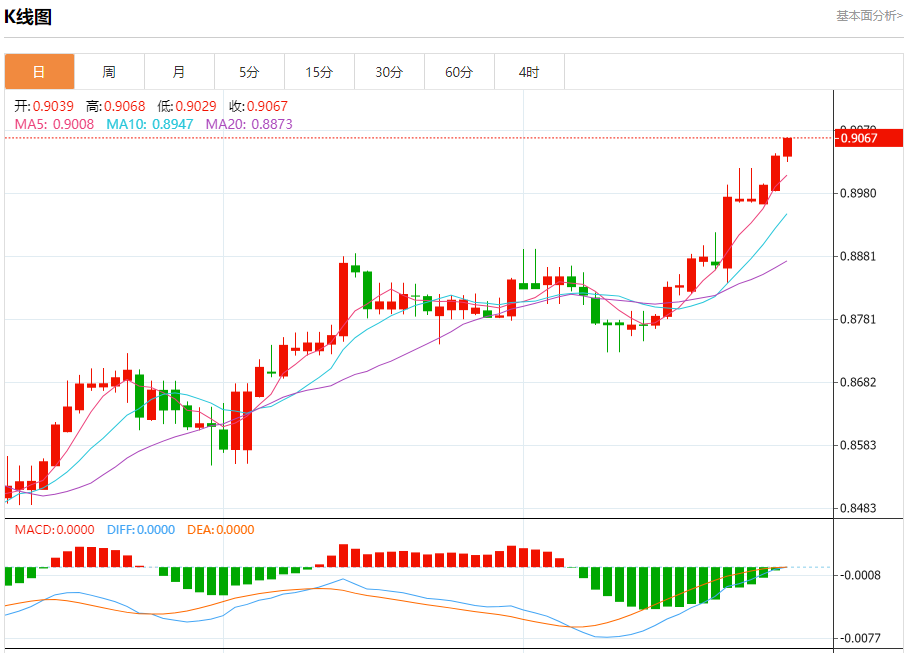 周三纽盘,瑞郎兑美元交投于0.9069,涨幅为0.31%。
